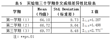 由表5可以看出,第一学期与第二学期相比,写作成绩均值由64.10上升到66.72,有2.62分的提高,第二学期与第三学期的写作成绩均值由66.72上升到69.77,有3.05分的提高,虽然经过Z检验这两个均值不存在显著性差异(Z的值分别是1.207和1.498),但是,从标准差来看,由9.73降到9.64,表明经过三个学期碎片化写作教学模式的实施,学生内部的成绩差异在缩小。同时,第一学期与第三学期的写作成绩均值由64.10上升到69.77,存在非常显著的差异(Z=2.771,p<.01),表明长期使用该教学模式能够明显地提高学生的英语写作水平。