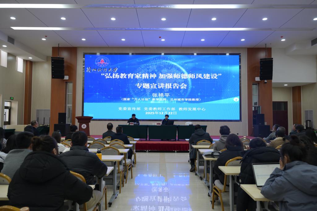 12月22日下午,“弘扬教育家精神 加强师德师风建设”宣讲报告会在和平校区博雅堂举行。学校特邀国家“万人计划”教学名师、教育部“国培计划”培训专家、甘肃省第一层次领军人才、兰州城市学院张艳平教授作专题报告,报告会由校党委常委、副校长黄恒君主持。