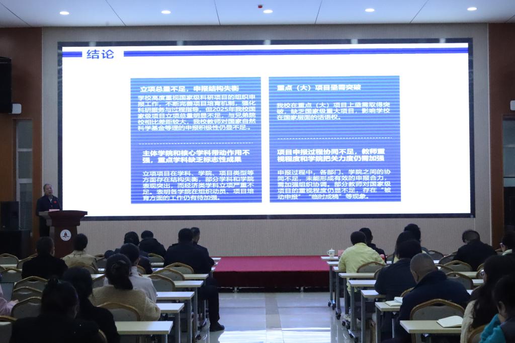 苏孜围绕我校2025年度三大国家级项目申报与立项情况、与部分兄弟院校立项情况对比分析以及下一步工作计划与措施等方面开展了分析和申报动员。姬新龙教授、肖强教授分别从自身成功立项的经验出发,就如何做好国家社会科学基金、国家自然科学基金等国家级项目的申报,做了系统、全面的经验分享与交流。