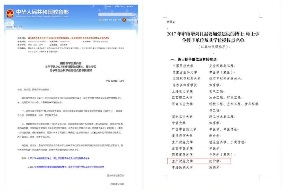 根据国务院学位委员会《关于下达2017年审核增列的博士、硕士学位授予单位及其学位授权点名单的通知》(学位〔2018〕19号),我校获批需要加强建设的博士学位授予单位,新增统计学博士学位授权一级学科。学校结合学科发展实际,统筹安排,细化任务,积极推进建设工作,有效弥补短板弱项,确保高质量地完成《兰州财经大学博士学位授予单位建设方案》2018—2020年度的各项建设任务,积极迎接国务院学位委员会进一步核查验收,实现博士研究生招生。同时积极抢抓国家新增学位授权审核机遇,新增马克思主义理论、设计学一级学科硕士学位授权点2个,总数到达7个;新增税务专业硕士学位授权点1个,总数达到10个。此次我校通过省级审核的新增硕士学位点数量在全省处于前列,为促进我校研究生教育发展奠定了坚实基础。